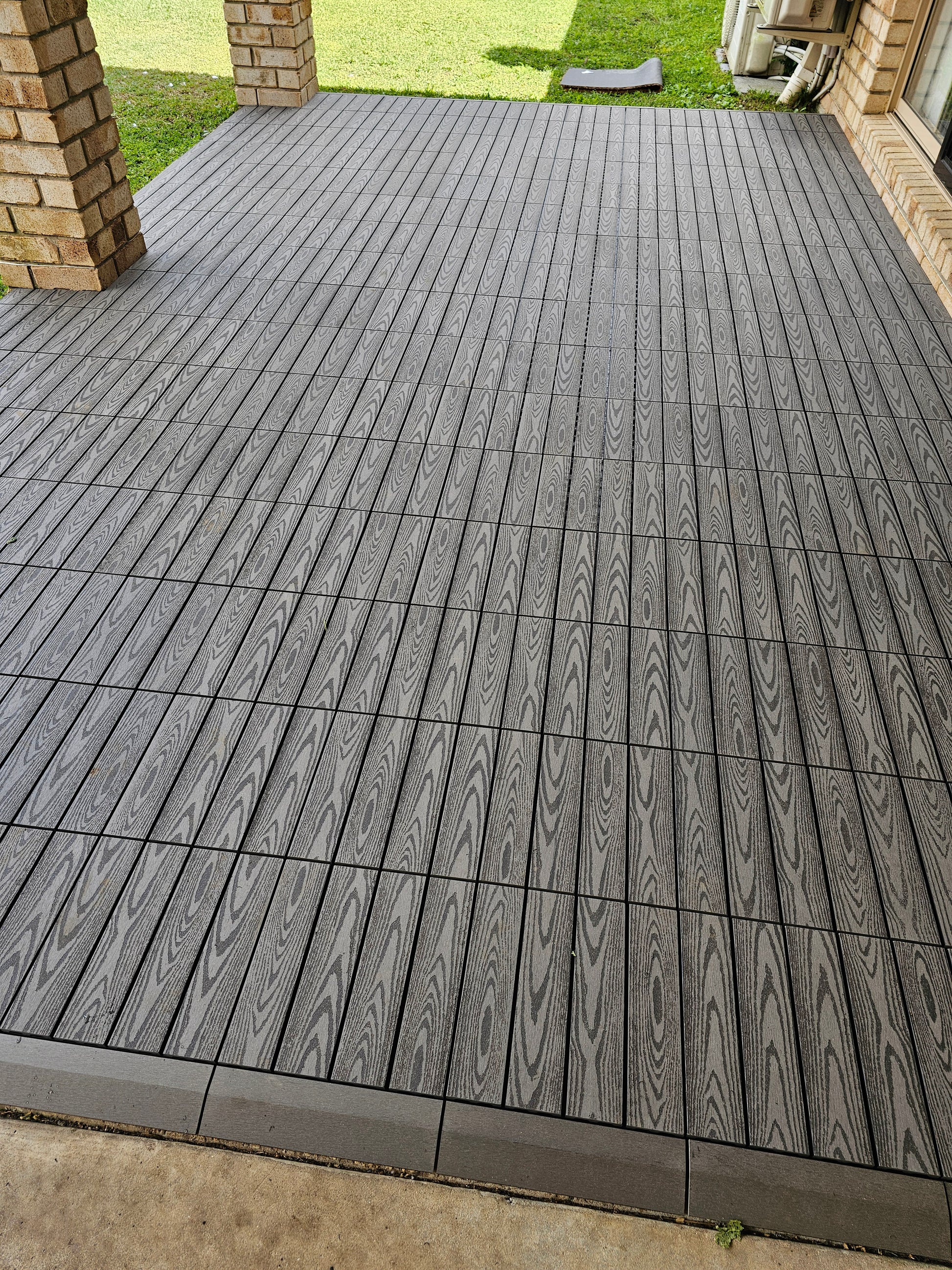 The decking tiles have an integrated base with drainage holes and don’t need to be installed on top of joists or bearers. The requirement for laying our composite decking tiles is a flat, relatively hard and even surface. Concrete patios, an existing stone patio, old existing decking or other hard surfaces are an ideal place to lay deck tiles because they are stable and durable. The decking tiles won’t interlock when laid on uneven surfaces, so you must be sure to fix any underlying issues before starting. Installing decking directly over dirt or grass isn’t recommended.